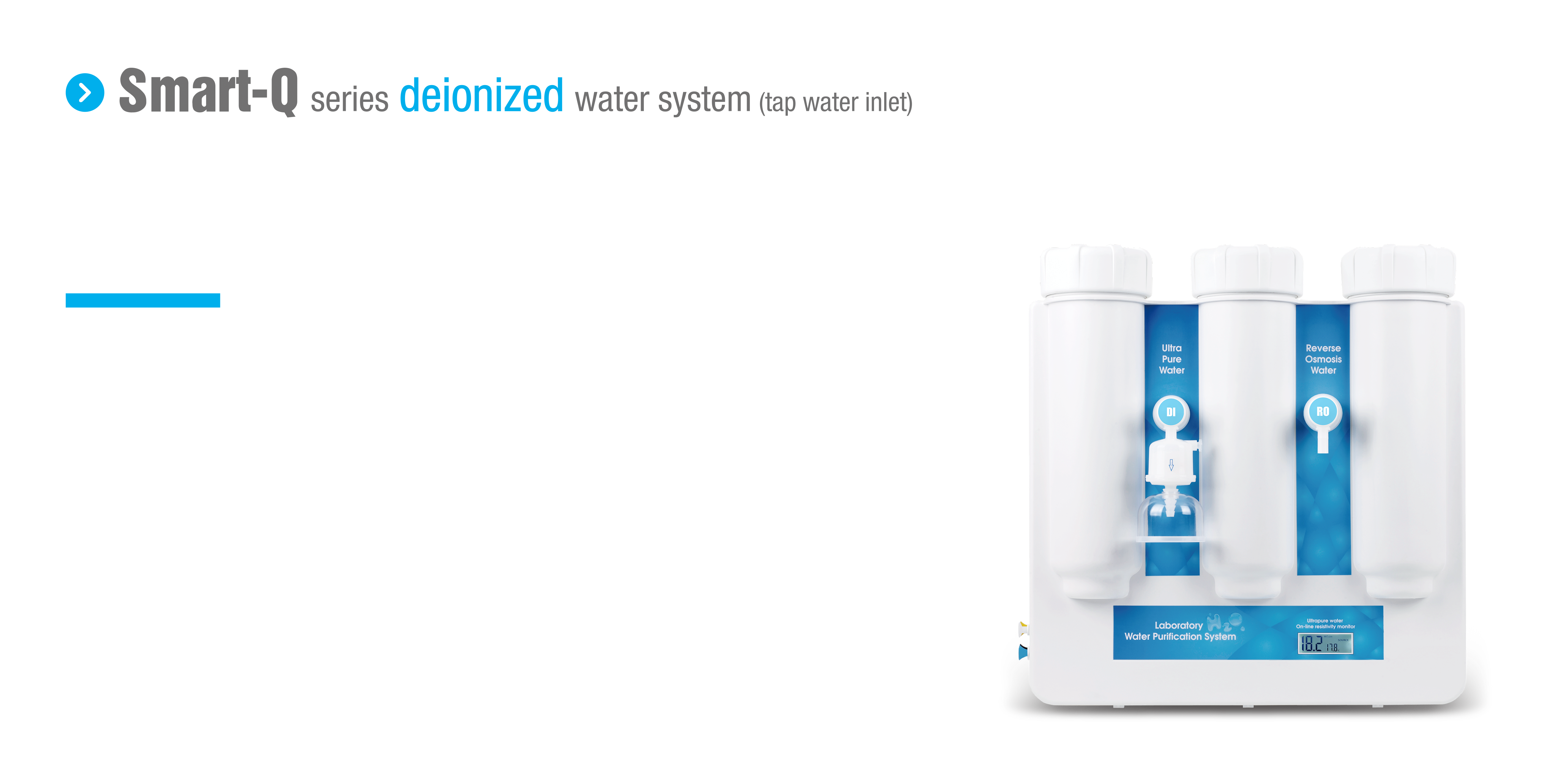 With injection molding process case, single stage RO system, 1 pump, portable TDS test pen and on-line resistivity monitor, Smart-Q series deionized water system is sub-economic choice of deionized water for general grade experiments.