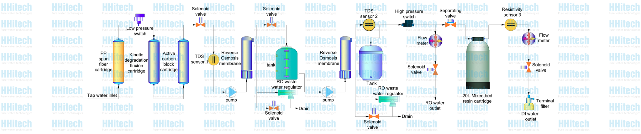 With tap water inlet, its output ranges from 45 to 90 liters/hour. It can produce 2nd stage RO water and deionized water. The 2nd stage RO water’s conductivity can stay 1-5μs/cm, and the deionized water’s resistivity absolutely reaches to 10MΩ.cm. It completely meets the requirements of general chemical or biological experiments for pure water.