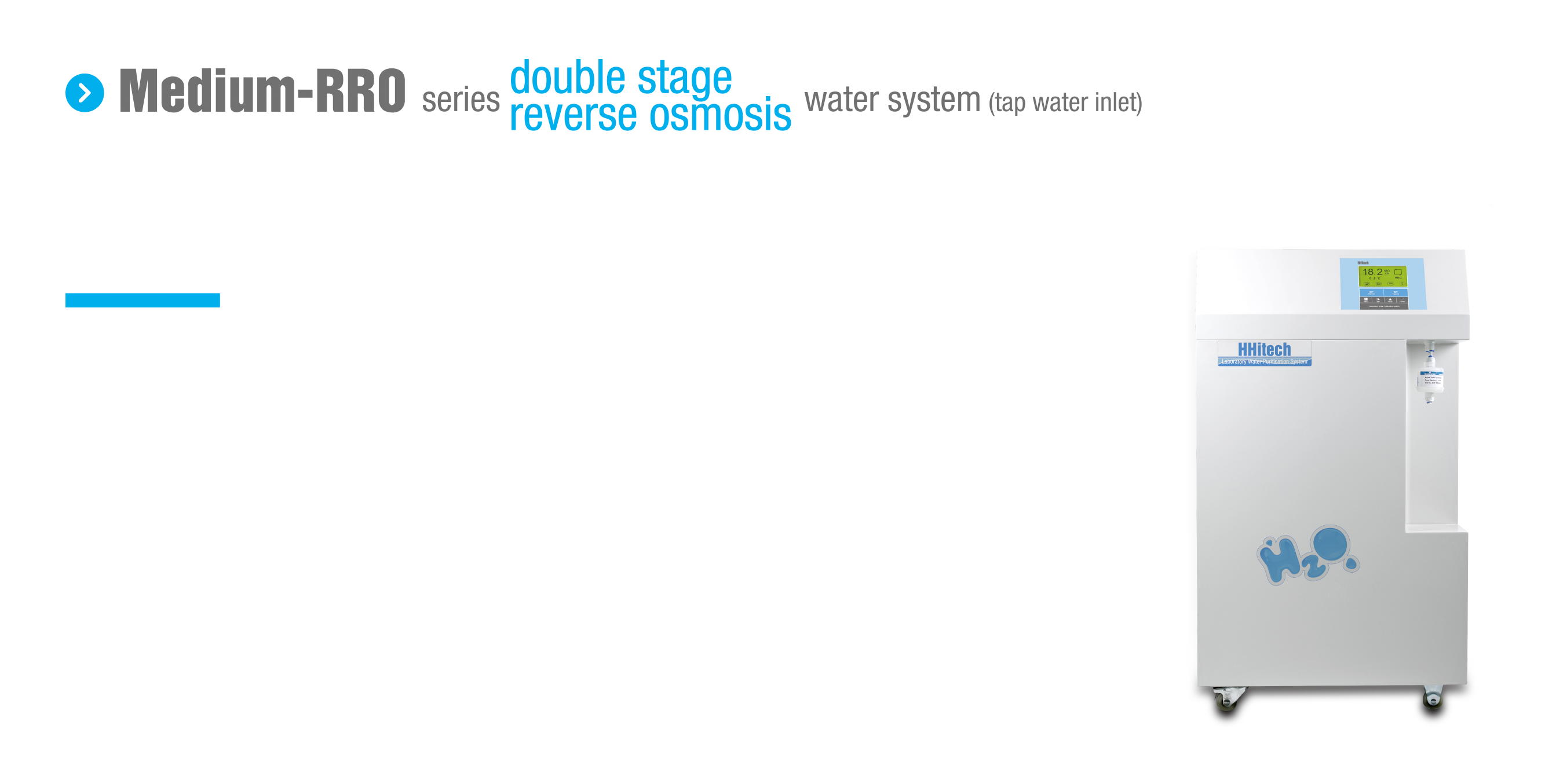 Medium-R series is standard double stage reverse osmosis system. With 2 stage pump, 2 stage RO membrane and buffer tank, system achieves stable water quality, little drain, and low running cost. Compared with single stage RO system, the quality of RO water is better, and the running cost is lower for less consumables replacement. Moreover, compared with simple 2nd stage RO system (1 pump, 2 RO membrane, without buffer tank), its system design is more rational, and the RO quality is more stable. Even though with the worse source water, the 2nd stage RO water’s conductivity also can stay 1-5μs/cm. Medium-RRO series is 2nd stage RO water system, with LCD controlling system, 3 way water quality sensor, cartridge replacing alarm, timing and quality dispensing, stainless steel shell, built-in 2 set tanks (buffer tank and pressure tank). Its output ranges from 30 to 90 liters/hour. And the 2nd stage RO water’s conductivity can stay 1-5μs/cm, suitable for glassware washing and general grade experiments.