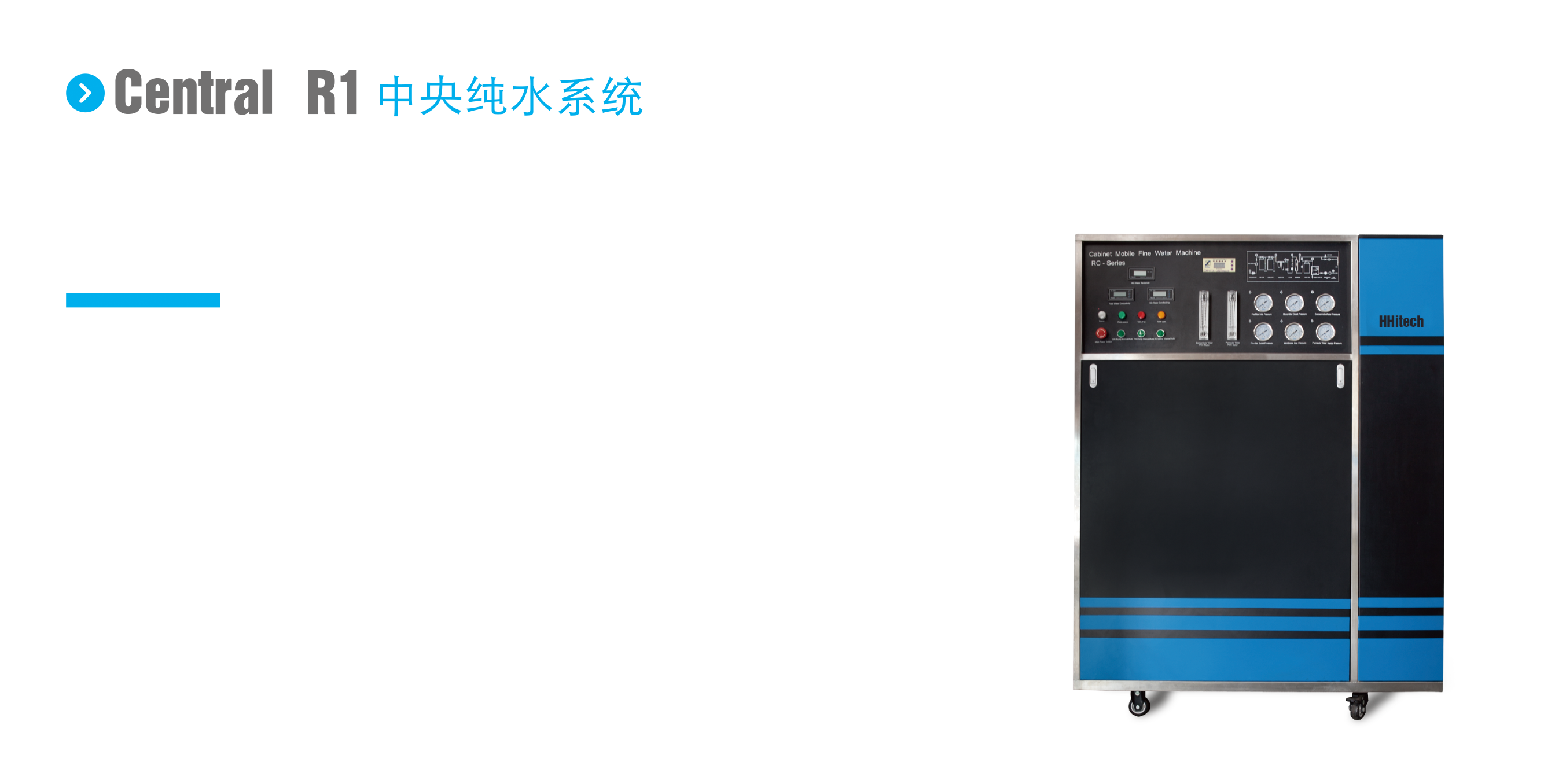 Central R1將預處理系統、RO 系統、DI 離子交換系統、UV 紫外光氧化系統、UF 超濾除熱原系統、MF 微濾系統、250L 不