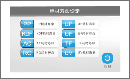 PP、KDF、AC、RO、DI、UP、UV、UF、TF耗材壽命可設(shè)定,顯示已使用時(shí)間及用量,到期自動(dòng)提醒更換.