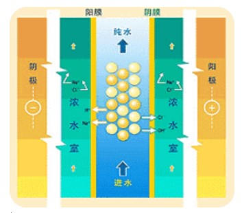 水通過一個或多個在陽離子或陰離子選擇膜之間填滿離子交換樹脂的管腔,在電場的作用下,離子在離子交換樹脂間向管腔的兩側移動并進入另外的管腔,這個過程中也會電解產生維持樹脂處于再生狀態所需的H+和OH- 。流向兩側獨立管腔的離子被水沖刷掉。